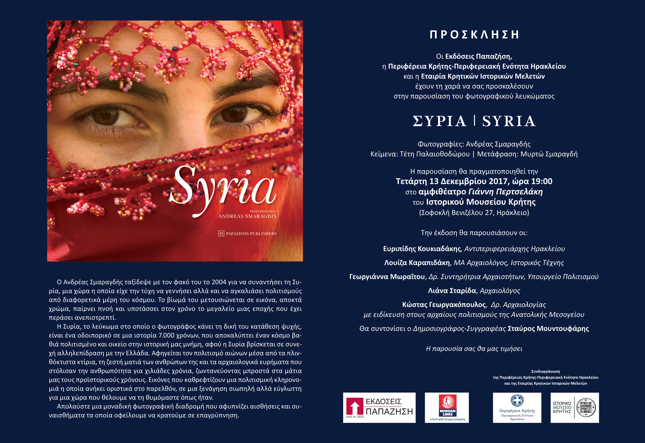 ΝέαΟι Εκδόσεις Παπαζήση, η Περιφέρεια Κρήτης-Περιφερειακή Ενότητα Ηρακλείου και η Εταιρία Κρητικών Ιστορικών Μελετών έχουν τη χαρά να σας προσκαλέσουν στην παρουσίαση του φωτογραφικού λευκώματος