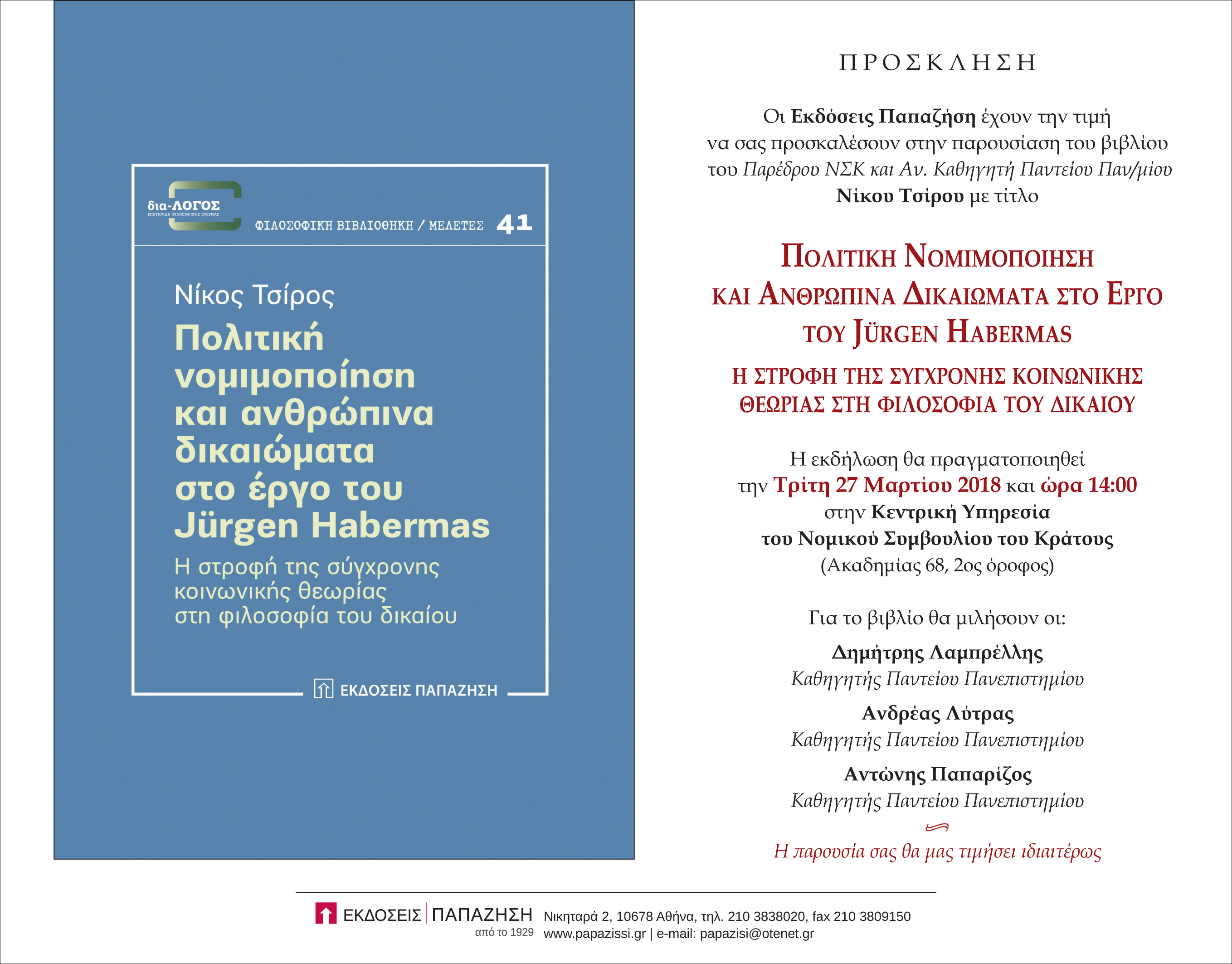 ΝέαΟι Εκδόσεις Παπαζήση έχουν την τιμή να σας προσκαλέσουν στην παρουσίαση του βιβλίου του Παρέδρου ΝΣΚ και Αν. Καθηγητή Παντείου Παν/μίου Νίκου Τσίρου με τίτλο