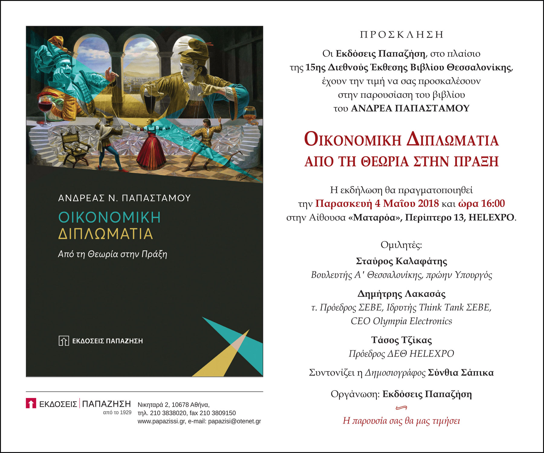 ΝέαΟι Εκδόσεις Παπαζήση, στο πλαίσιο της 15ης Διεθνούς Έκθεσης Βιβλίου Θεσσαλονίκης, έχουν την τιμή να σας προσκαλέσουν στην παρουσίαση του βιβλίου του ΑΝΔΡΕΑ ΠΑΠΑΣΤΑΜΟΥ