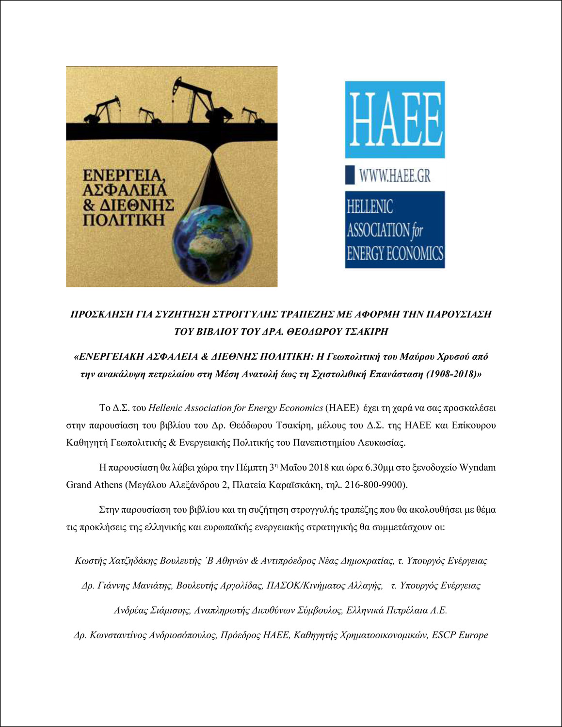 Το Δ.Σ. του Hellenic Association for Energy Economics (ΗΑΕΕ) έχει τη χαρά να σας προσκαλέσει στην παρουσίαση του βιβλίου του Δρ Θεόδωρου Τσακίρη, μέλους του Δ.Σ. της HAEE και Επίκουρου Καθηγητή Γεωπολιτικής & Ενεργειακής Πολιτικής του Πανεπιστημίου Λευκωσίας.