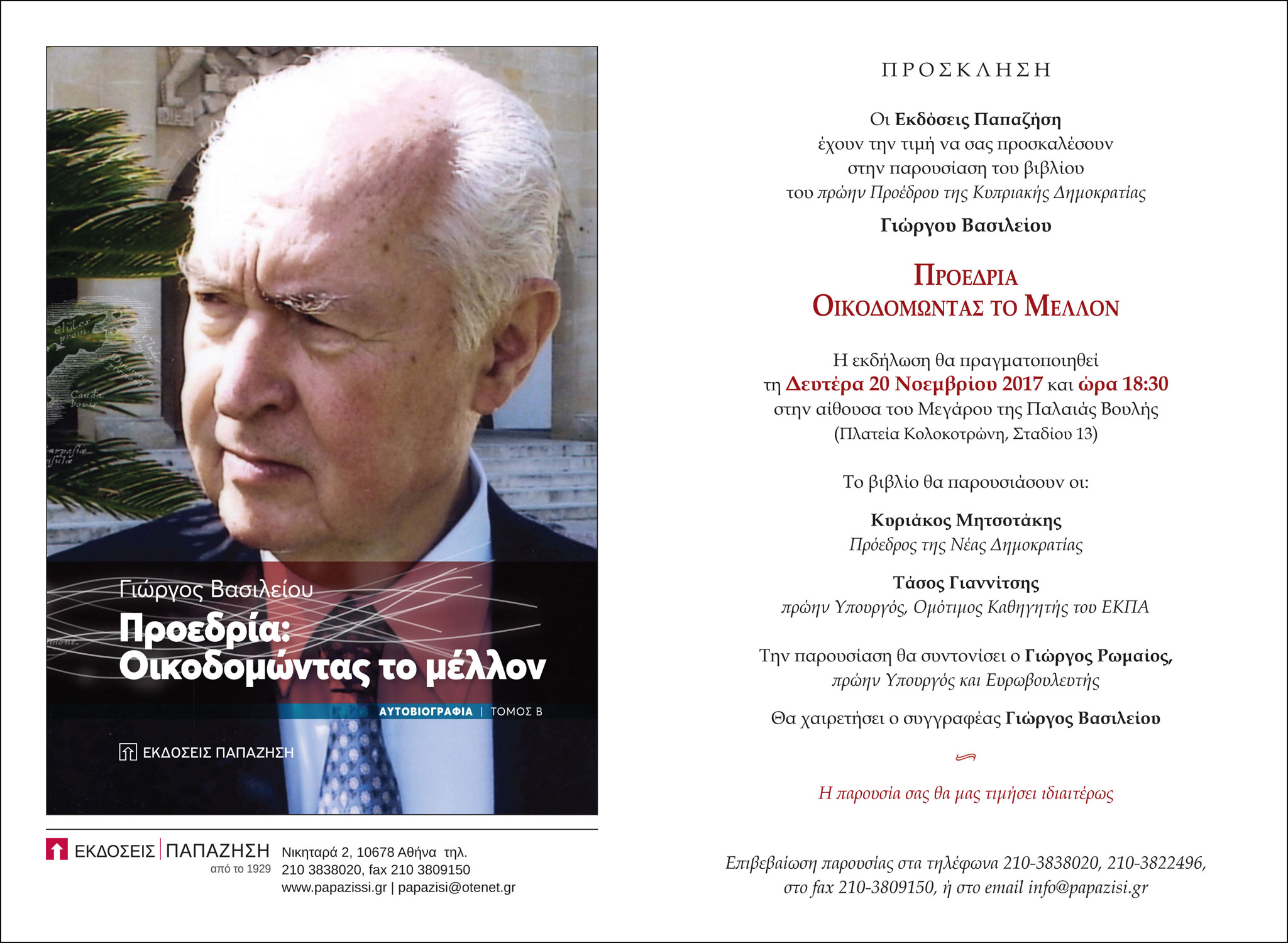 ΝέαΟι Εκδόσεις Παπαζήση έχουν την τιμή να σας προσκαλέσουν στην παρουσίαση του βιβλίου του πρώην Προέδρου της Κυπριακής Δημοκρατίας Γιώργου Βασιλείου