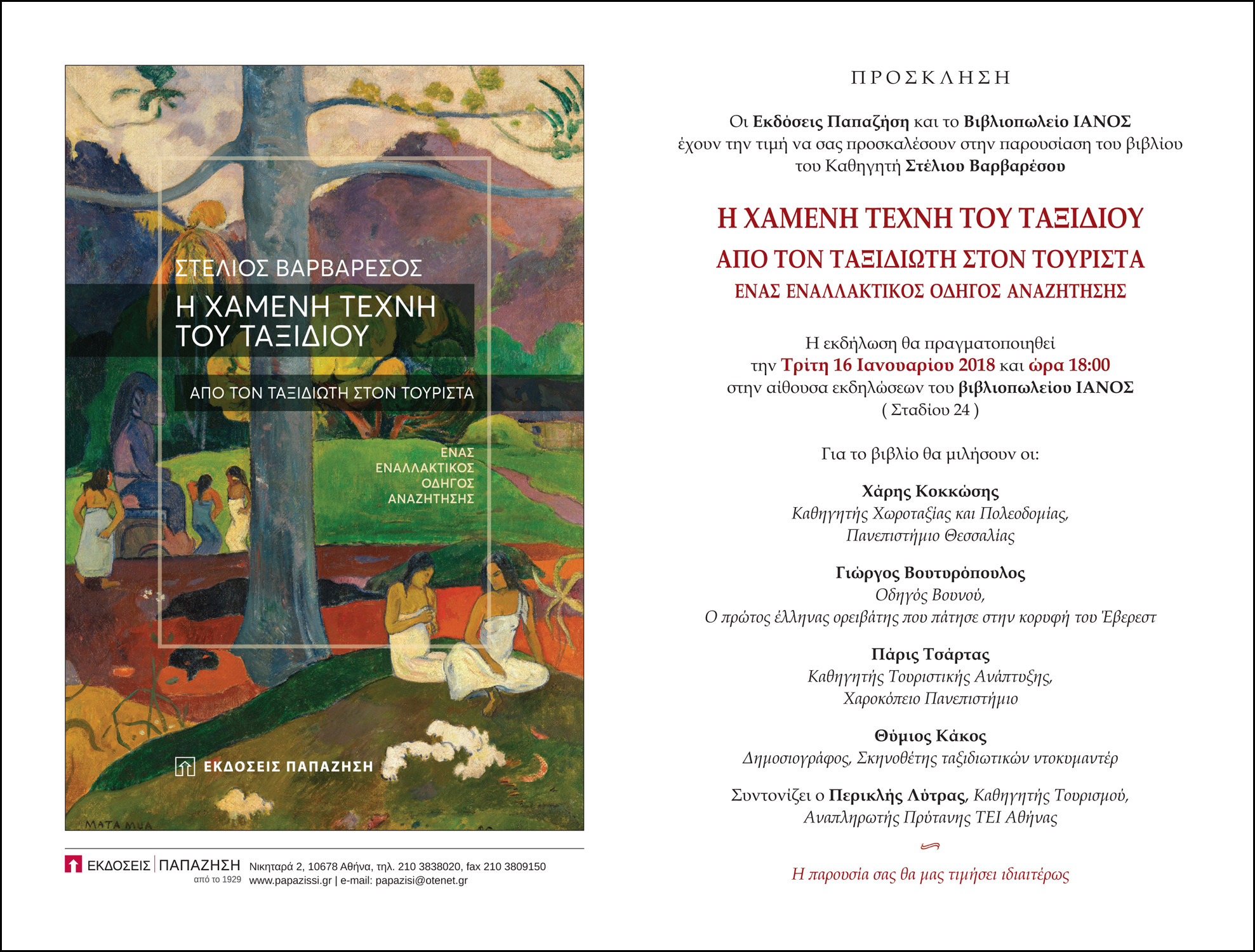 Η εκδήλωση θα πραγματοποιηθεί την Τρίτη 16 Ιανουαρίου 2018 και ώρα 18:00 στην αίθουσα εκδηλώσεων του βιβλιοπωλείου ΙΑΝΟΣ (Σταδίου 24)