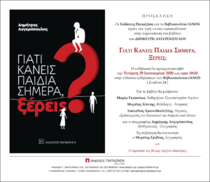 ΝέαΟι Εκδόσεις Παπαζήση και το Βιβλιοπωλείο IANOS έχουν την τιμή να σας προσκαλέσουν στην παρουσίαση του βιβλίου του ΔΗΜΗΤΡΗ ΑΥΓΕΡΟΠΟΥΛΟΥ
