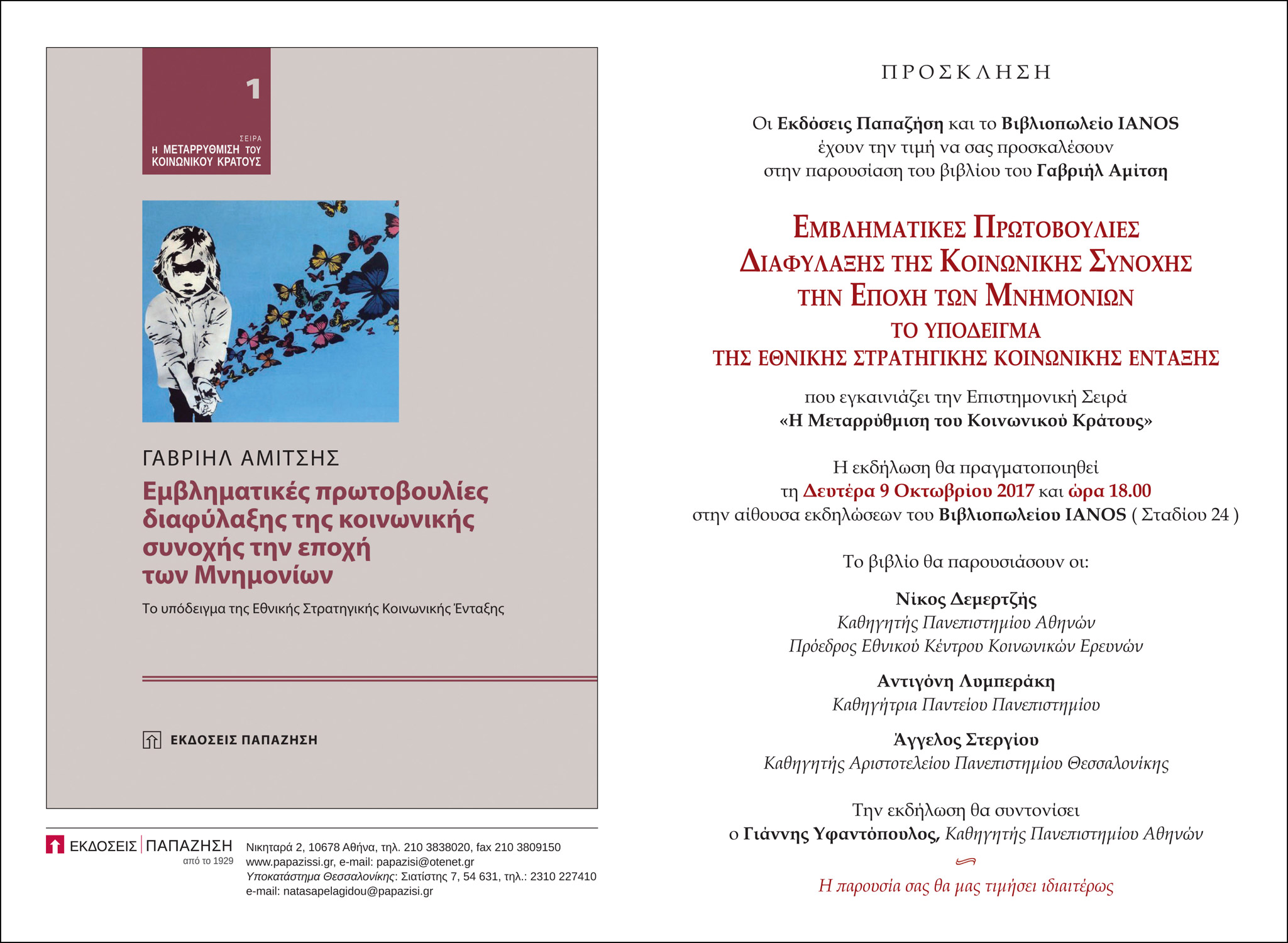 ΝέαΟι Εκδόσεις Παπαζήση και το Βιβλιοπωλείο IANOS έχουν την τιμή να σας προσκαλέσουν στην παρουσίαση του βιβλίου του Γαβριήλ Αμίτση
