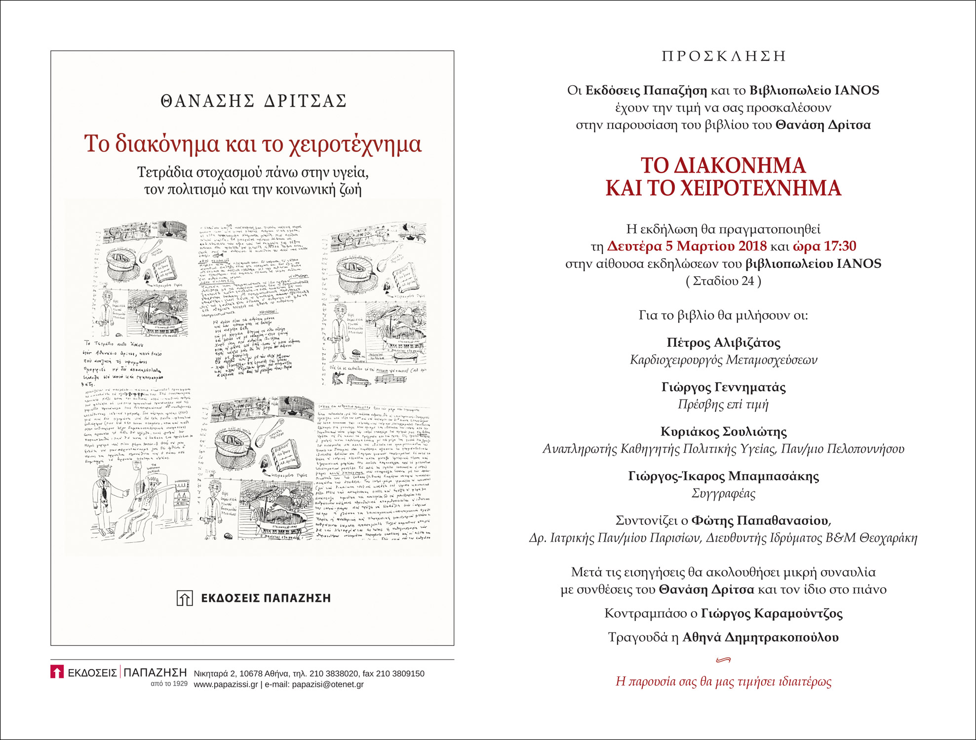 ΝέαΟι Εκδόσεις Παπαζήση και το Βιβλιοπωλείο IANOS έχουν την τιμή να σας προσκαλέσουν στην παρουσίαση του βιβλίου του Θανάση Δρίτσα