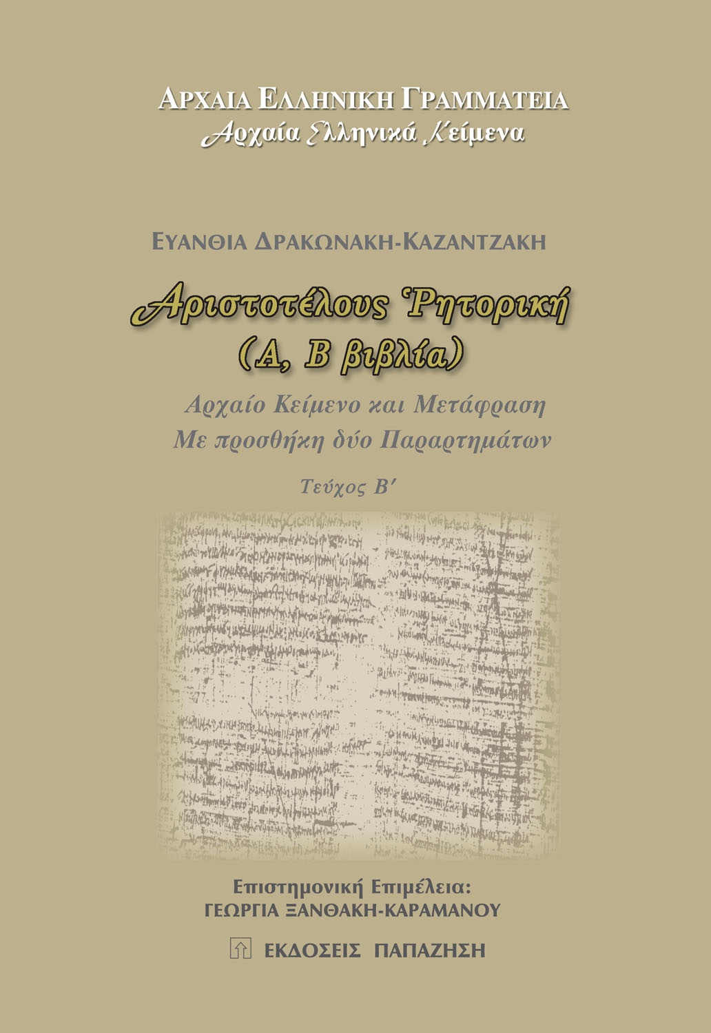 Το παρόν πόνημα συνιστά μια προσπάθεια συμπαραθέσεως της κορυφώσεως και των αρχών της θεωρίας για την Αττική Ρητορεία. Προς τούτο, κατά πρώτον δίδονται το αρχαίο κείμενο και η μετάφραση εκάστου βιβλίου, Α και Β, της κυρίως ‘Ρητορικής του Αριστοτέλους· στην συνέχεια, εν είδει παραρτήματος προς το αριστοτελικό έργο, δίδονται αφ’ ενός το αρχαίο κείμενο και η μετάφραση εκάστου εκ των δυο σωζόμενων λόγων του Γοργίου, “Ελένης εγκώμιον” και “Υπέρ Παλαμήδους απολογία”, αφ’ ετέρου το χαρακτηριστικό για την διορατικότητά του άρθρο του Charles P. Segal, “Gorgias and the Psychology of the Logos” HSCP 66 (1962) 99-155, σε νεοελληνική μετάφραση ως “Ο Γοργίας και η ψυχολογία του Λόγου”. Το αρχαίο κείμενο κατά την έκδοση W. D. Ross: “Aristotelis Ars Rhetorica” first published, Oxford University Press 1959, Α και Β βιβλία, προσετέθη εκ των υστέρων με εξομάλυνση τονικών ή άλλων λαθών της παραπάνω εκδόσεως· τα τελευταία δηλώνονται εντός παρενθέσεως με την ένδειξη sic. Παρατηρήσεις κριτικού και εκδοτικού υπομνήματος είχαν ήδη καταχωρηθή στην οικεία μεταφραστική ενότητα. Οι “σελίδες” κατά την έκδοση Bekker δίδονται πλήρως, π.χ., 1354a, 1354b (και όχι συντομευμένες, π.χ., 54a, 54b)). […] (από το προλογικό σημείωμα του βιβλίου)