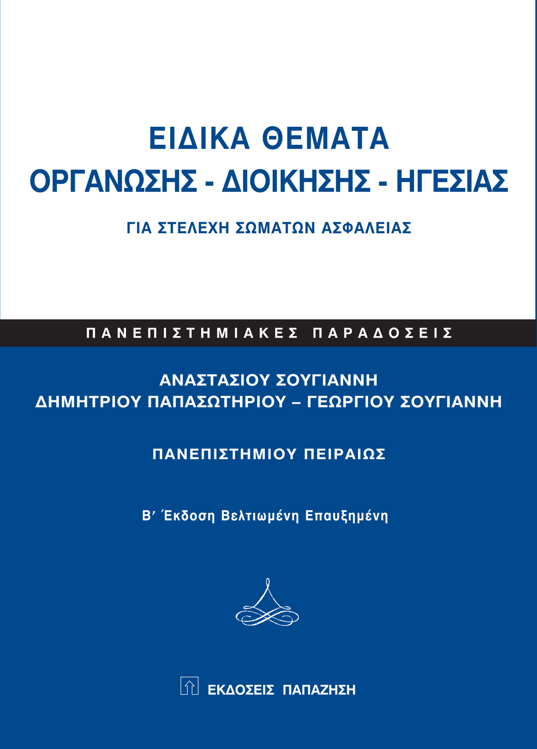 Το παρόν σύγγραμμα περιλαμβάνει τη διδακτέα ύλη του μαθήματος “Οργάνωση – Διοίκηση – Ηγεσία” της Ακαδημίας της Ελληνικής Αστυνομίας -Σχολής Αξιωματικών. Βασίζεται στις παραδόσεις του Τακτικού Καθηγητή της Σχολής Αξιωματικών και Μετεκπαίδευσης της Ελληνικής Αστυνομίας / Πανεπιστημίου Πειραιά κυρίου Σούγιαννη Αναστασίου, ο οποίος διδάσκει το συγκεκριμένο μάθημα στη Σχολή από το 2002. Αναλύει με διεξοδικό τρόπο θέματα διοίκησης, οργάνωσης και ηγεσίας προσαρμοσμένα στα ελληνικά σώματα ασφαλείας, τα οποία κάθε σύγχρονος διοικητής πρέπει να κατέχει ώστε να: – οργανώνει κατά τον πλέον αποδοτικό τρόπο την υπηρεσία του, – ανταποκρίνεται άμεσα και αποτελεσματικά στις υπηρεσιακές του υποχρεώσεις ως ηγέτης, – επιτυγχάνει την καλή και απρόσκοπτη λειτουργία της υπηρεσίας του, – βελτιώνει την απόδοση των υφισταμένων του, – χειρίζεται κρίσιμες υπηρεσιακές καταστάσεις. Ύστερα από συνεχή πρωτογενή και δευτερογενή έρευνα στο χώρο του Management των σωμάτων ασφαλείας αλλά και προτάσεις και υποδείξεις από ανώτατα στελέχη των σωμάτων ασφαλείας, οι τρεις συγγραφείς (Σούγιαννης Αναστάσιος, Παπασωτηρίου Δημήτριος και Σούγιαννης Γεώργιος) παρουσιάζουν με ικανοποίηση την Β΄ έκδοση του βιβλίου που είναι βελτιωμένη και επαυξημένη, με τη βεβαιότητα ότι έχουν καλύψει ένα κενό της ελληνικής βιβλιογραφίας σχετικά με το θέμα και ότι συνδράμουν στο δύσκολο έργο των σημερινών και μελλοντικών ηγετών διαφόρων επιπέδων των ελληνικών σωμάτων ασφαλείας.