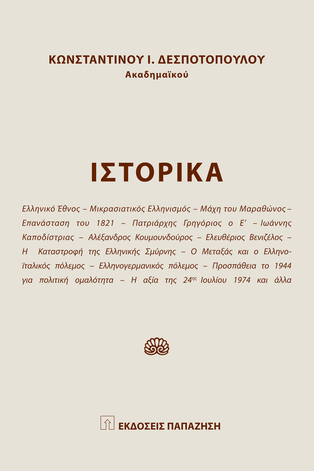 Το βιβλίο αυτό είναι συλλογή δημοσιευμένων ήδη άρθρων, επιστολών και Λόγων μου για το Ελληνικό Έθνος, θεωρημένο συνοπτικά, είτε για σπουδαία γεγονότα και πρόσωπα, ενταγμένα ήδη στην Ιστορία του ή εντακτέα σ’ αυτήν, καθώς και για προσφάτως εκδομένα βιβλία ιστορίας. Η γραφή των ήδη κεφαλαίων του βιβλίου, με άλλη αφορμή του καθενός, υπαγορεύθηκε από συναίσθηση καθήκοντος: είτε για να τιμηθεί επέτειος, είτε για να διορθωθεί καίρια ή να συμπληρωθεί δημοσίευμα, είτε για να προβληθεί ορθά η δράση διάσημου πολιτικού, είτε για να επισημανθεί γεγονός αξιομνημόνευτο είτε για ό,τι άλλο. Δεν αποτελεί άρα το βιβλίο αυτό σύγγραμμα Ιστορίας με αξιώσεις πληρότητας, αφού η συγγραφή του έγινε με διάφορες αφορμές. Εξηγείται λοιπόν και η έλλειψη κεφαλαίων ειδικών για την έξοχη στην Κατοχή της χώρας συμπεριφορά του ελληνικού λαού, μάλιστα και με την Εθνική Αντίσταση από 1941-1944, ή και για τις θλιβερότατες εμφύλιες συγκρούσεις ή και για προσωπικότητες περιωπής καθώς π.χ., ο Χαρίλαος Τρικούπης, ο ταλαντούχος αυτός πολιτικός με δράση πολύτιμη για την Ελλάδα της εποχής του, που και από έφηβος είχε διακριθεί, ως μαθητής παναριστούχος του πρώτου Γυμνασίου Αθηνών, μόνος αυτός έως το 1928. Οι όποιες επαναλήψεις κάποτε από κεφάλαιο σε κεφάλαιο ή μάλλον παραλλαγές στο ίδιο θέμα συγχωρούνται ως αναγκαίες για την ολοκληρία του κάθε κεφαλαίου· ή και υποδηλώνουν την ιδιαίτερη του θέματος σπουδαιότητα, είτε απλώς την εμμονή μου στον καλόν αγώνα για σεβασμό της αλήθειας περί του Ελληνικού Έθνους. Έκγονο της ευαισθησίας μου και της εμπειρίας μου ή και της όποιας ευθυκρισίας μου το βιβλίο αυτό, γραμμένο δίχως προκαταλήψεις και χωρίς μεροληψία, με προσήλωση προς την ιστορική αλήθεια, ευπρόσδεκτο ελπίζω να είναι από αισθαντικούς αναγνώστες ή και από συγγραφείς βιβλίου Ιστορίας. Και ας μου επιτραπεί να εξηγήσω, πώς δικαιούμαι την εμπιστοσύνη των ως συγγραφεύς του βιβλίου αυτού, αν και δεν είμαι ιστορικός. Από την θητεία μου ως διακόνου της φιλοσοφίας, και ιδιαίτερα της φιλοσοφίας της Ιστορίας, διαθέτω πολύτιμα, πιστεύω, κριτήρια για τα ουσιώδη της ιστορικής πραγματικότητας· αλλά επί πλέον είχα την ευτυχία επί δεκαετίες να προσαποκτώ αυξημένη διορατικότητα για τα ιστορικά γεγονότα, καθώς στη γένεσή του παρακολουθούσα το έργο του ρηξικέλευθου ιστορικού, αειμνήστου δίδυμου αδελφού μου, Αλεξάνδρου Ι. Δεσποτόπουλου. (από τον πρόλογο του συγγραφέα