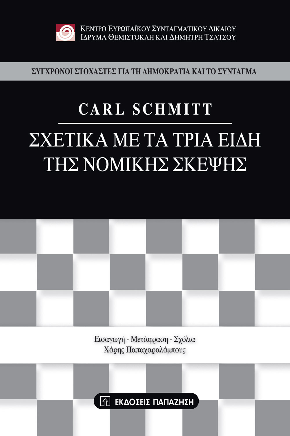 “Η μελέτη για τα τρία είδη της νομικής σκέψης αποτελεί στην σμιτιανή εργογραφία πράγματι την ισχυρότερη ένδειξη όχι μιας καμπής, αλλά ενός διλήμματος και ενός αδιεξόδου για τον συγγραφέα της. Ο Schmitt αναζητά στη σκέψη της συγκεκριμένης τάξης, που πρωτοκαθιερώνει εδώ, μια σύνθεση εγελειανού τύπου, που υπερβαίνει τον θετικισμό ως άθροισμα των αρνητικών στοιχείων της δεοντοκρατίας και της αποφασιοκρατίας, αναζητά δηλαδή μια θετικότητα με νομικοπολιτική ισχύ χωρίς τυχαίες ανάλογα με τη στιγμή αποφάσεις.” (από την Εισαγωγή του Χ. Παπαχαραλάμπους)