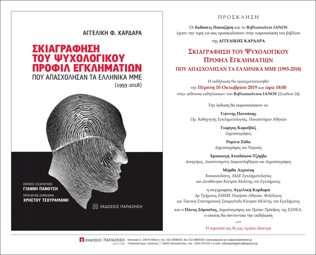 η συγγραφέας Αγγελική Καρδαρά, Δρ Τμήματος ΕΜΜΕ Παν/μίου Αθηνών, Φιλόλογος και Τακτική Επιστημονική Συνεργάτιδα Κέντρου Μελέτης του Εγκλήματος
